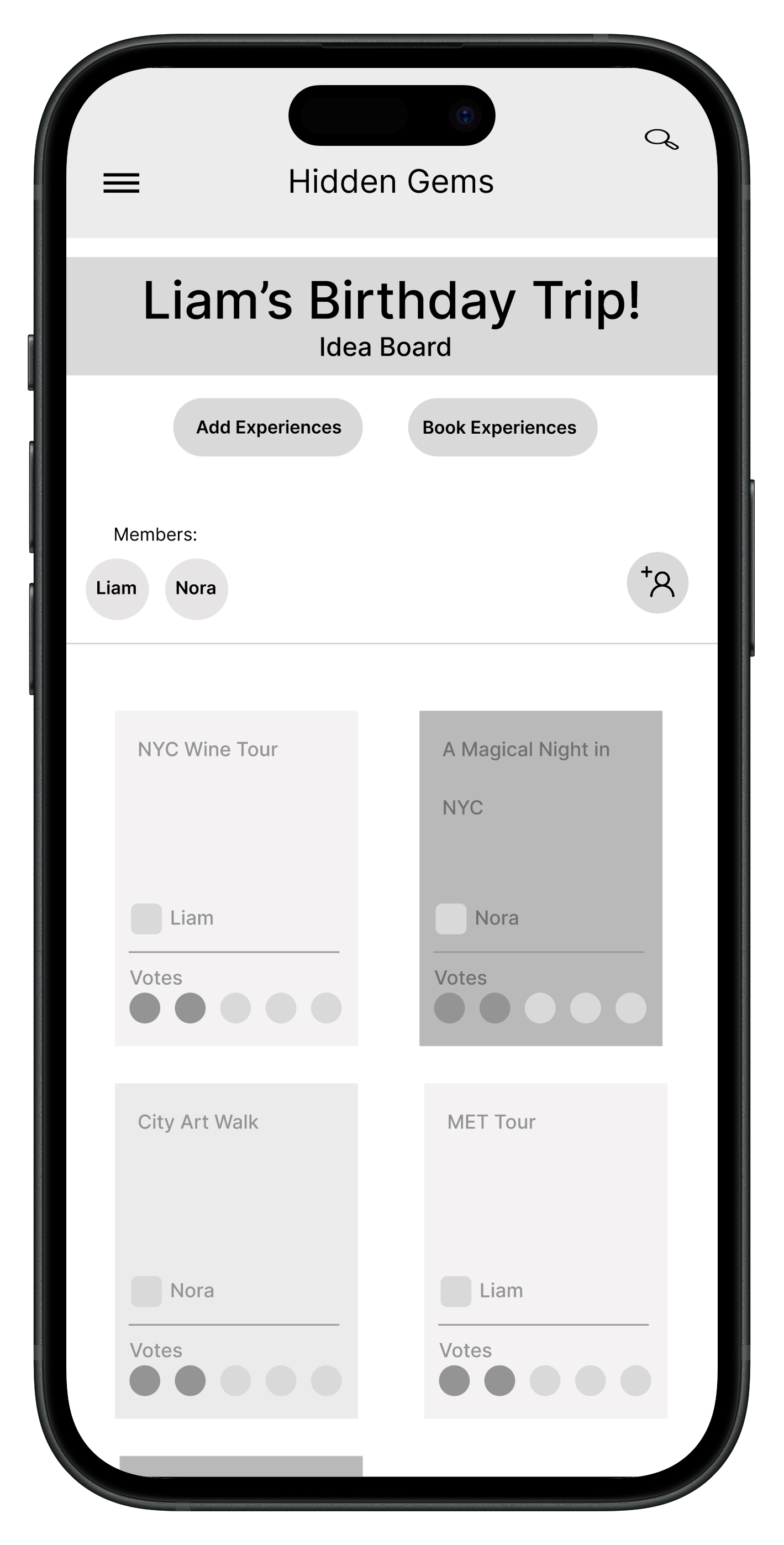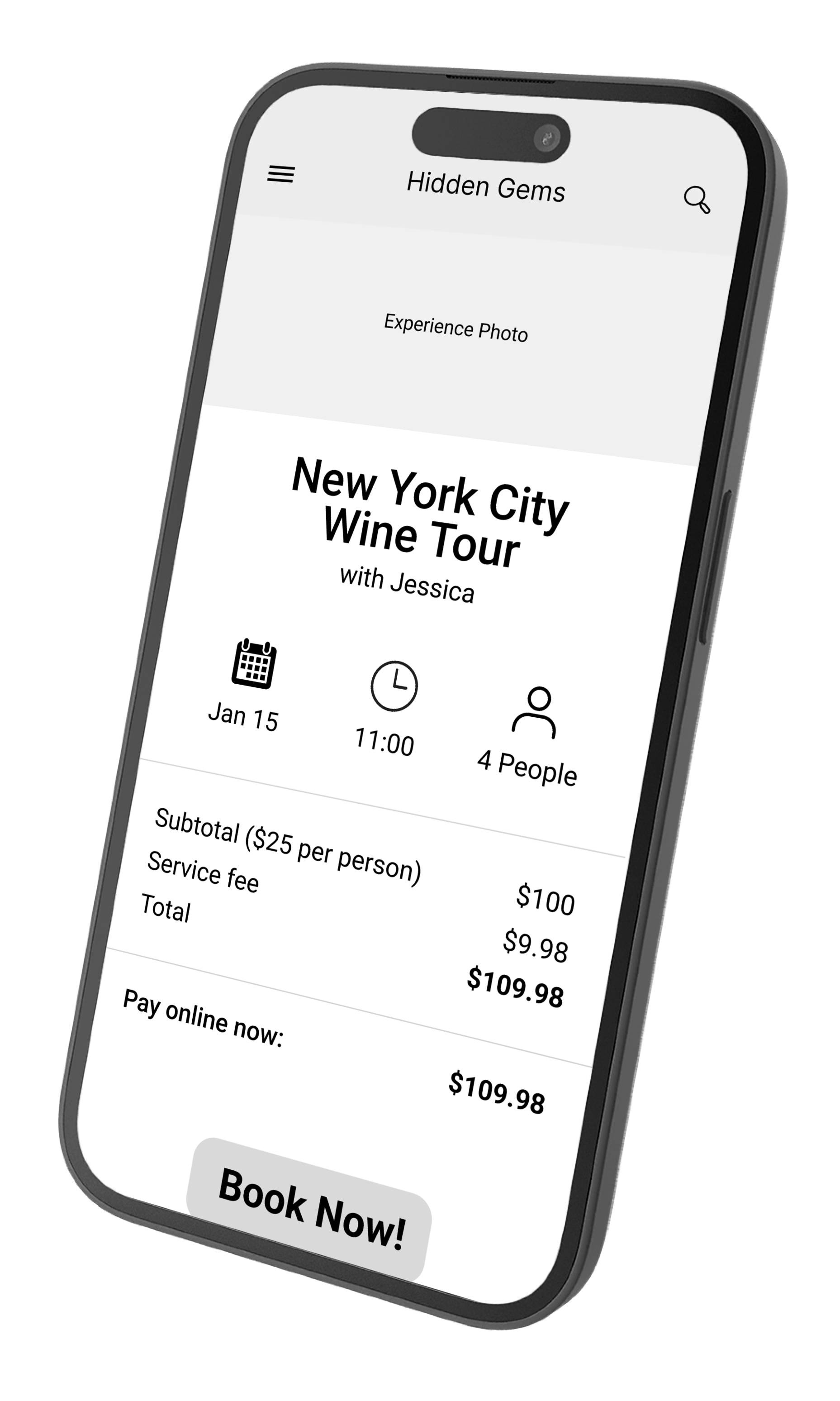 Hidden Gems is a conceptual app that helps group travelers find authentic, local experiences while staying within budget. The goal was to create a collaborative platform that connects users with local tour guides and reduces reliance on crowded tourist traps.